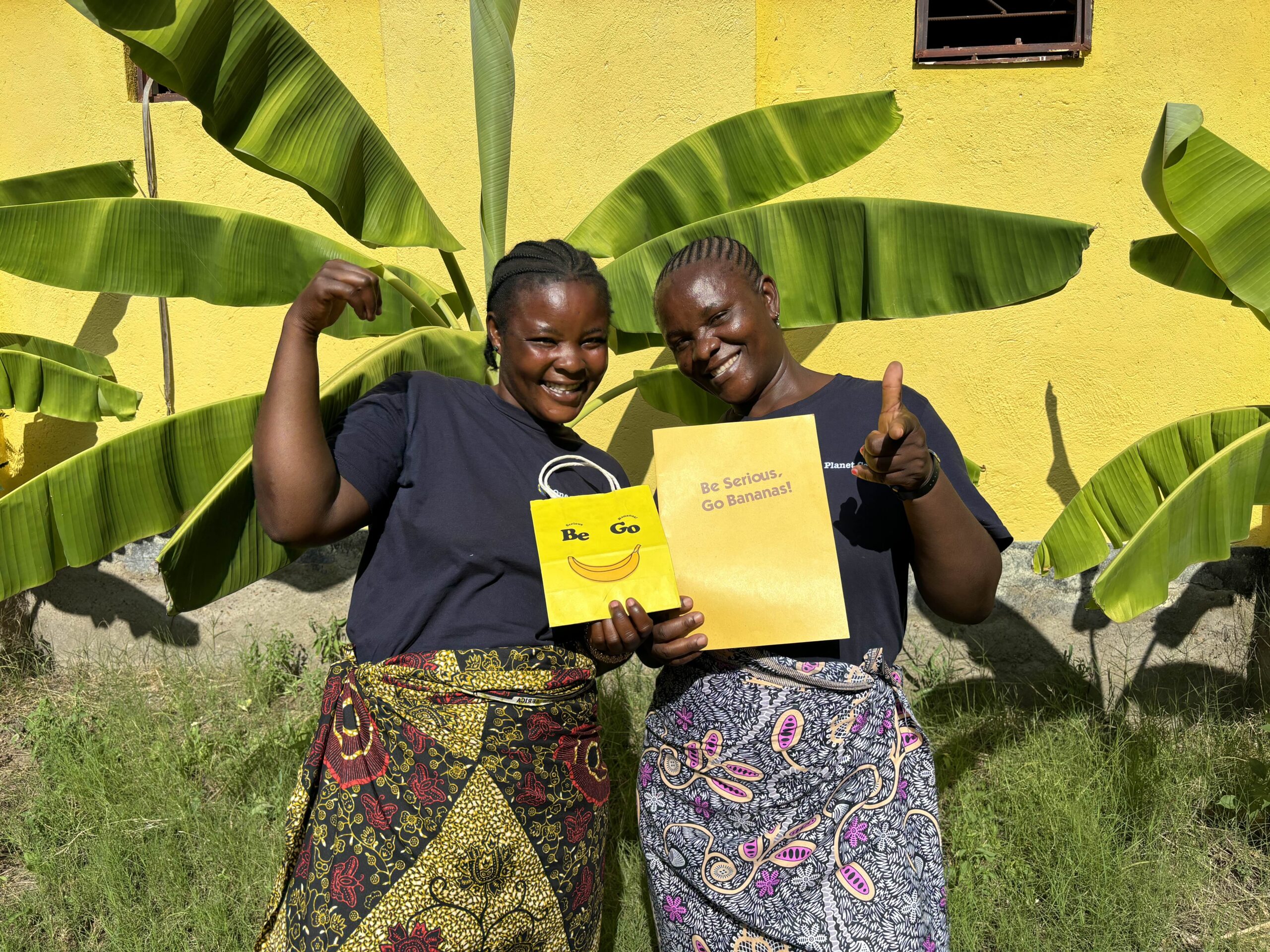 フェアトレードバナナペーパーの商品を持つチームメンバー。いつも明るく前向きに働く姿に元気をもらう(写真:永江早紀)